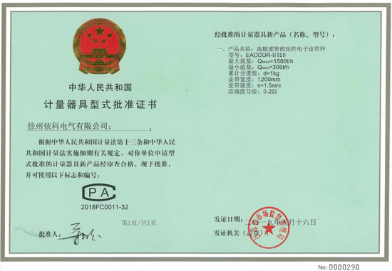 熱烈祝賀徐州依科電氣有限公司專利技術(shù)高精度智控矩陣電子皮帶秤EACCOR-B159獲得0國家0.2級(jí)計(jì)量證書CPA2018FC0011-32批準(zhǔn)證書,配套高精度矩陣傳感器及矩陣智能稱重控制器(采用SEQ-AI智能算法,矩陣控制跟蹤復(fù)核技術(shù),...